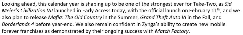Spekulace o tom, jestli veleočekávané GTA VI stihne vyjít ještě letos, jedou na plné obrátky. Vypadá to však, že minimálně vydavatelství Take Two s tím počítá, protože pro letošek potvrdili hned trojici velkých her. Jako první by v létě měla vyjít Mafia The Old Country. Na podzim by pak mělo následovat právě GTA VI a jako poslední by v letošním roce mělo vyjít připravované Borderlands 4. Zdrojem těchto informací je oficiální dokument Take Two ohledně finanční situace, jehož stěžejní část najdete níže. Tak uvidíme, zda se přesně tento jízdní řád potvrdí, ale pokud ano, o zábavu na dlouhé zimní večery bude vystaráno.