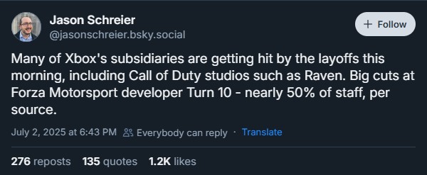 S touto zprávou přišel reportér agentury Bloomberg Jason Schreier, který má v podobných případech velmi přesné informace. Schreier uvádí, že „propouštění zasahuje mnoho dceřiných studií Xboxu“ a že „téměř polovina lidí byla propuštěna právě v Turn 10 Studios.“
