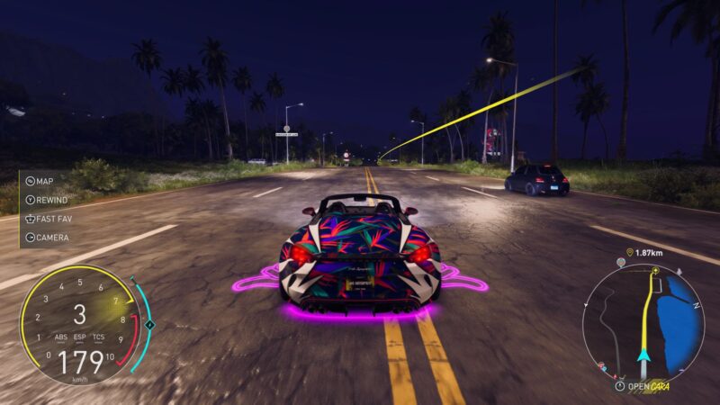 A hurá na další negativní věc, kterou je opravdu hodně šílené uživatelské rozhraní. 3D mapa sice vypadá cool a není problém zoomovat na celý ostrov nebo detail silnice, ale v celém konceptu se ztrácí to hlavní – žlutá čára označující naši cestu k cíli. To ještě ale není nic oproti zbytku menu, které je zbytečně komplikované. Místo toho, aby vývojáři věci rozdělili na více kategorií, je všechno ponořené v sobě a když chcete udělat upgrade svého vozu, musíte se v menu ponořit opravdu hluboko. Volba jednotlivých playlistů je ideální skrze rychlý výběr, kde je všechno po ruce, ale zpracování kompletního přehledu dostupných playlistů, nejrůznějších výzev a dalšího obsahu mě děsí ještě teď. A to jsem ještě zapomněl na hodně bohatou multiplayerovou část s další várkou obsahu a herních módů, jako je třeba automobilový battle royale.
