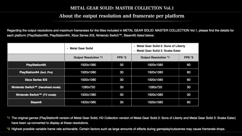 Kolem technického fungování připravované Metal Gear Solid kolekce (Metal Gear Solid: Master Collection Vol. 1) panovaly nejasnosti. Nejdříve to vypadlo, že všechny díly pojedou ve FHD rozlišení při 60 FPS, ale jak dnes Konami oznámilo, nebude tomu tak. Tedy alespoň co se těch snímků týče, protože Full HD rozlišení nakonec opravdu nabídnou všechny tituly. Co se týče počtu snímků, při 60 FPS poběží Metal Gear Solid 2: Sons of Liberty a Metal Gear Solid 3: Snake Eater. První díl na všech platformách nabídne 30 FPS (viz tabulka níže). Kompilace prvních tří dílů se na Xbox Series objeví 24. října.